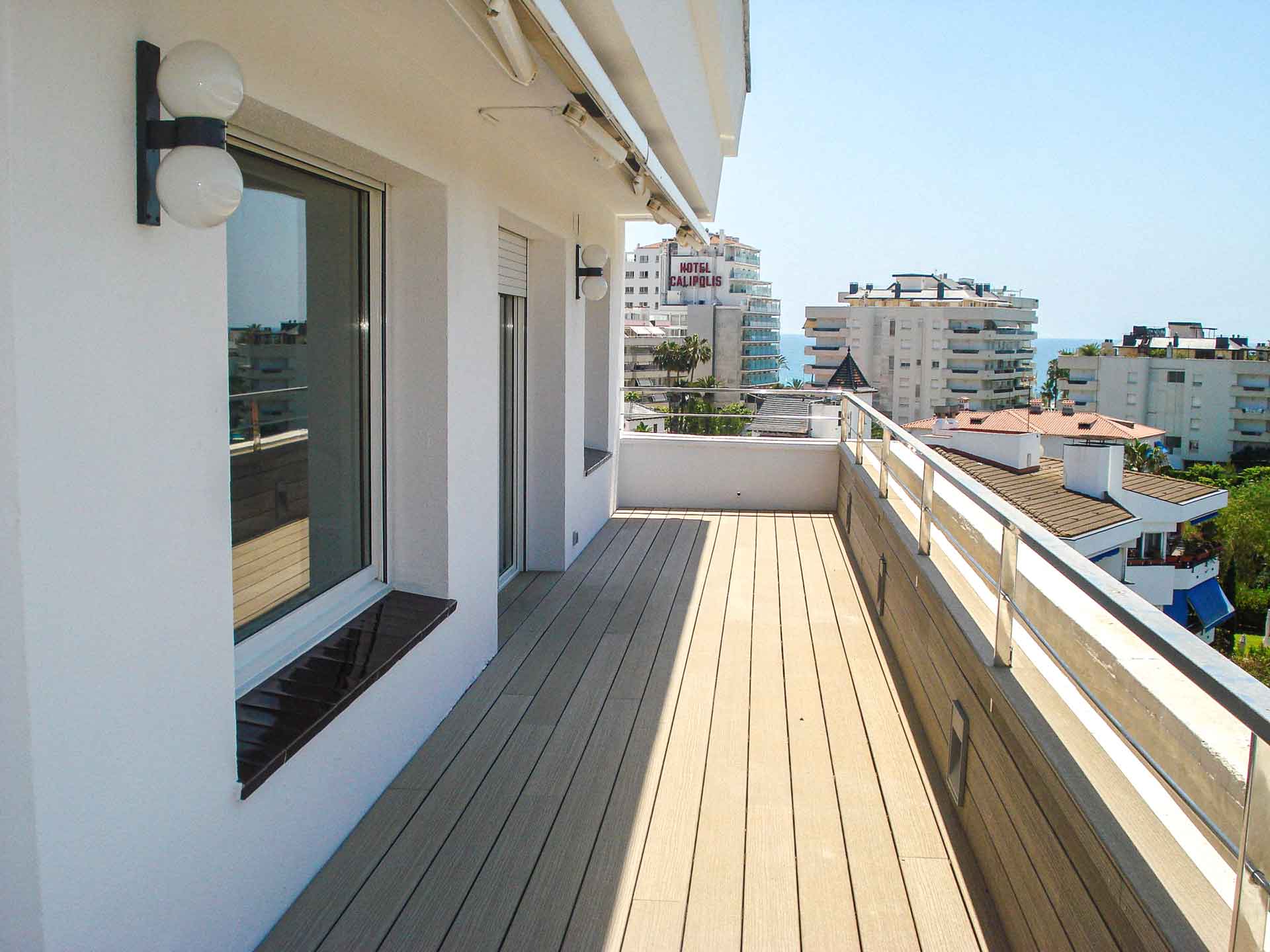 • En la imagen del antes, se puede ver la madera desgastada, con pérdida de color y protección, afectando no solo la estética sino también la durabilidad del revestimiento.
